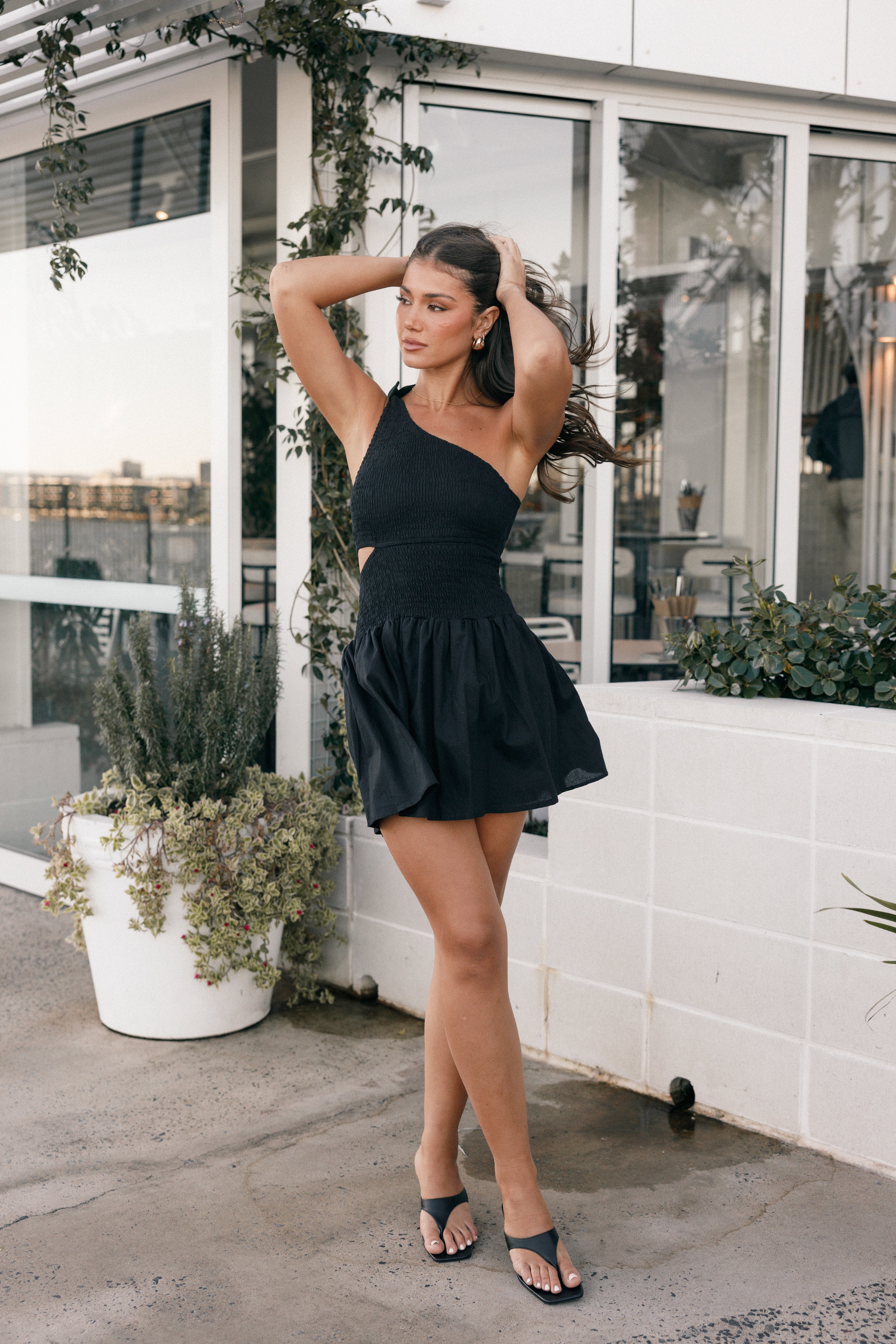 DETAILS This one shoulder mini dress is the perfect way to show off your style. With its shirred bodice, asymmetric neckline and side cut out detail you will be sure to make a statement.