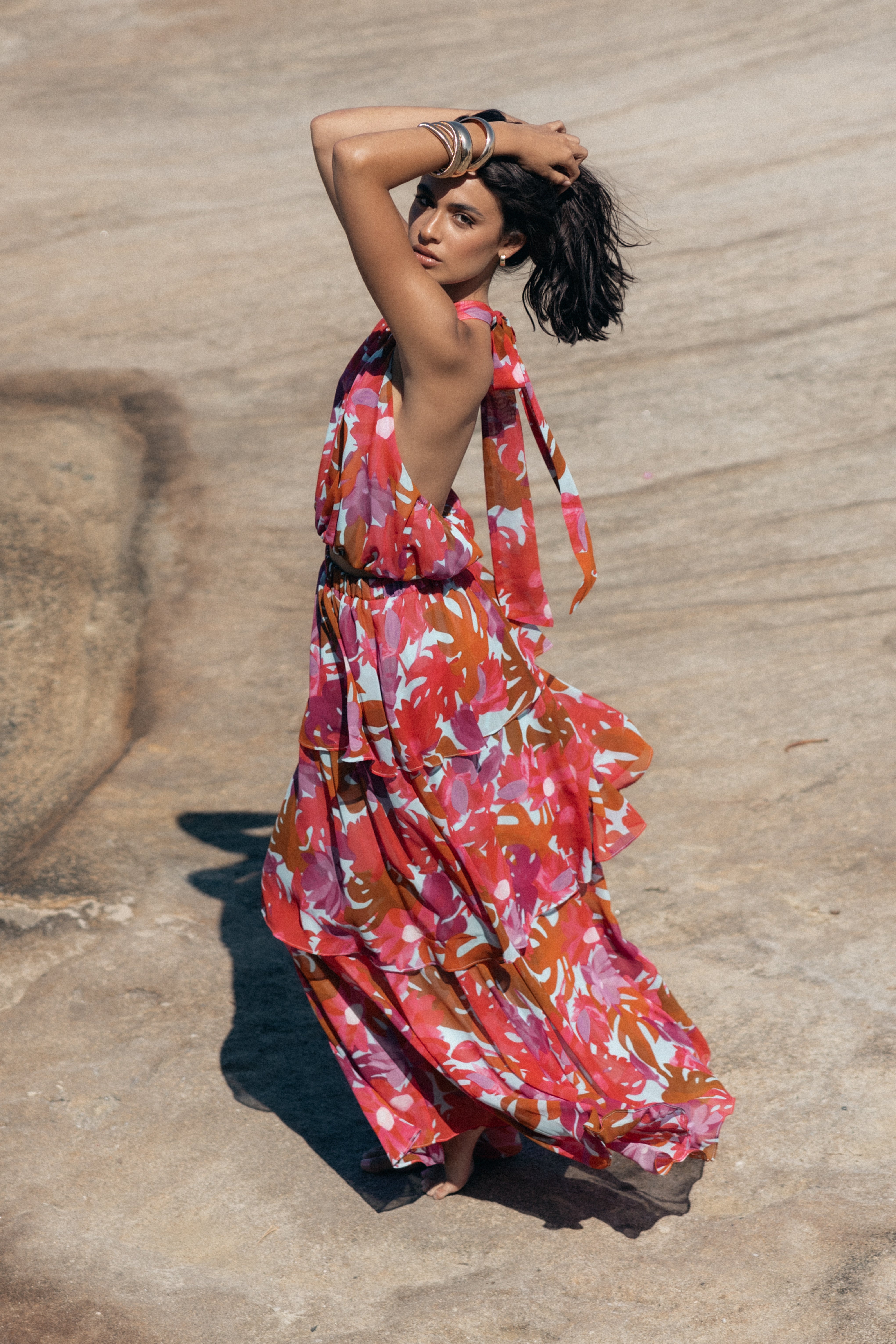|   DETAILS This maxi length skirt is perfect for creating an elegant look. It features a high waisted style with an elasticised waistband for maximum comfort. The drop tiered design gives it a flattering silhouette, and the pink floral print adds a delicate touch of femininity.