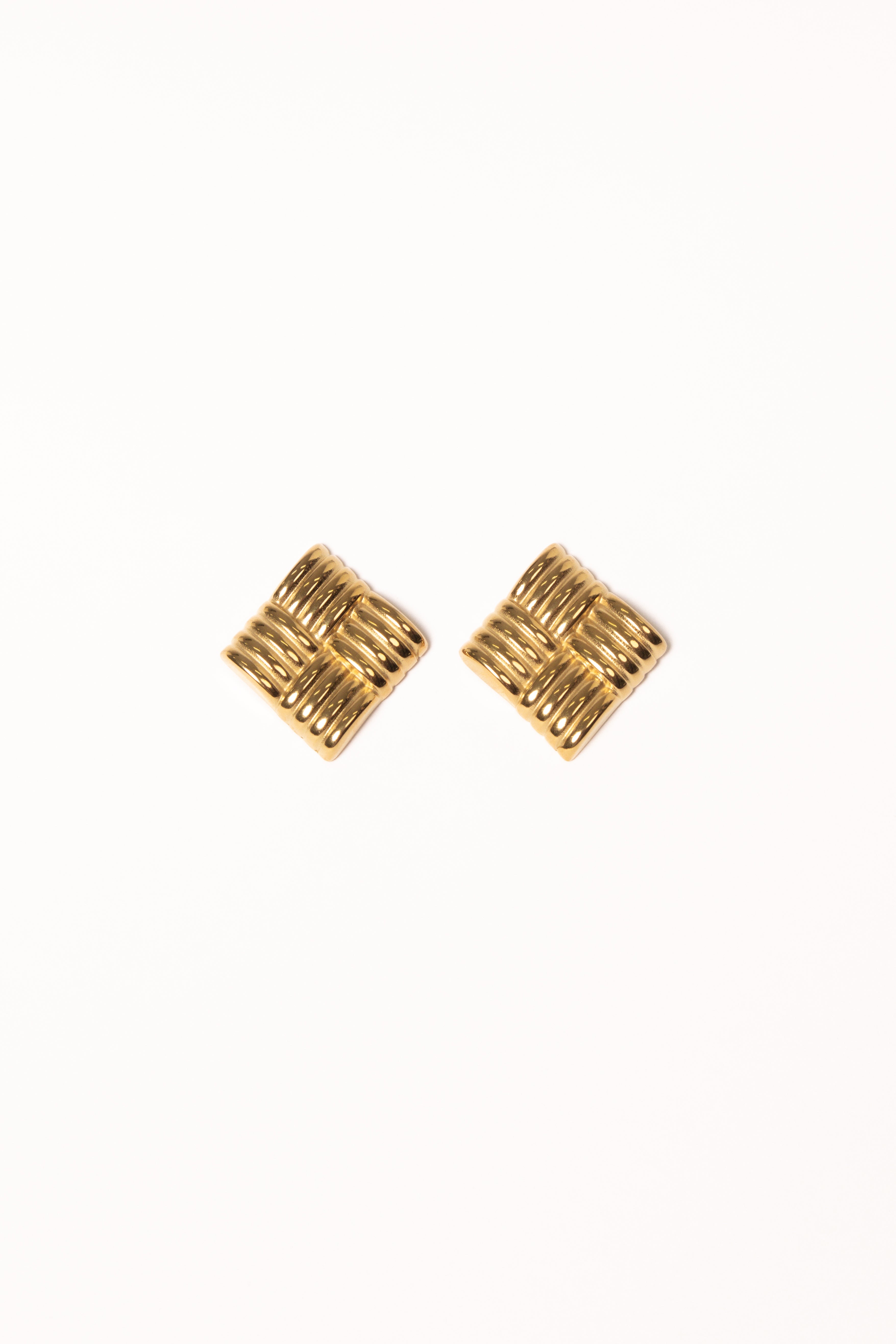 DETAILS Elevate your everyday look with the effortlessly chic Rinna Earrings in Gold. Featuring a bold, large square design with an intricately woven texture, these earrings are a modern twist on a timeless statement piece.