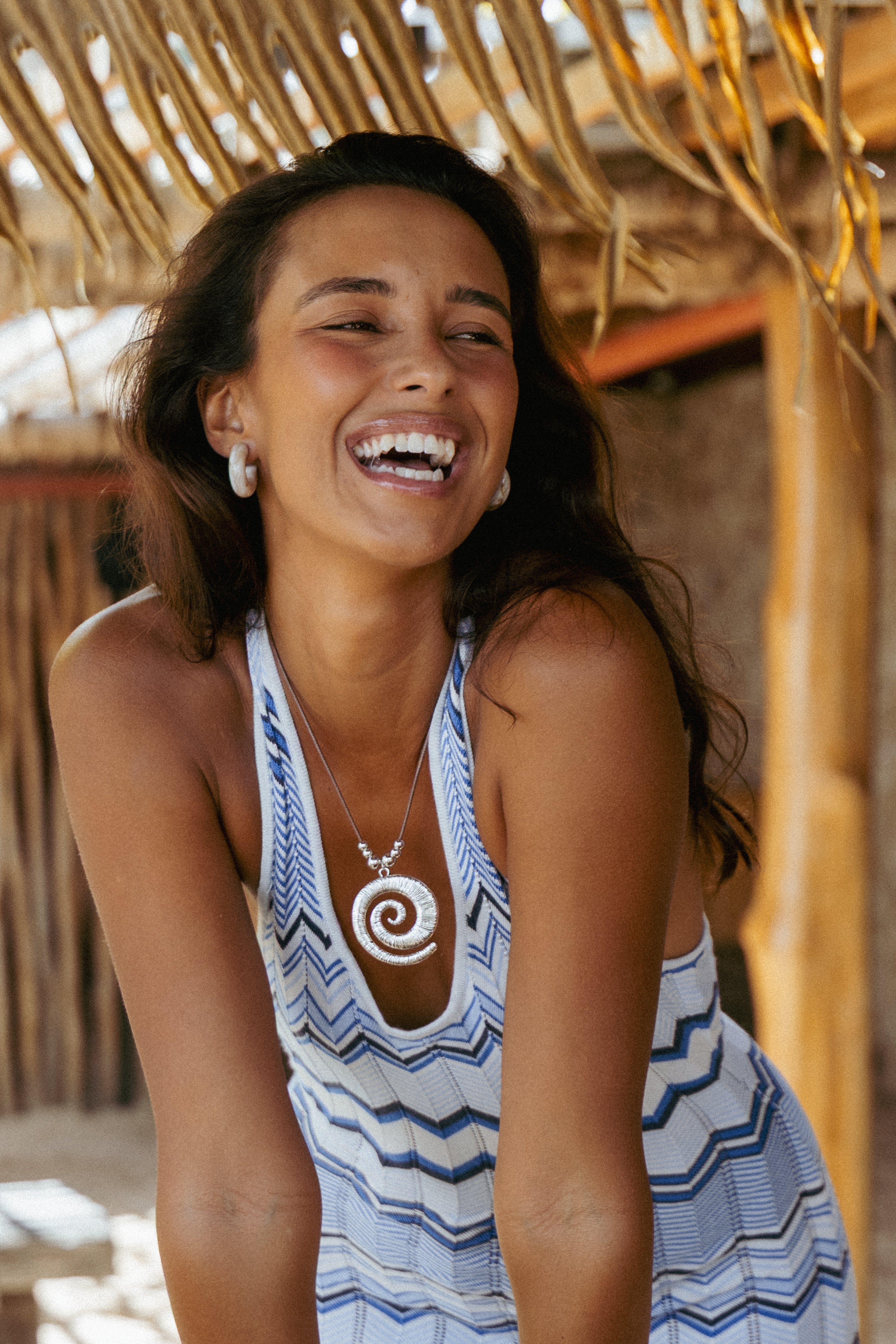 DETAILS Add a touch of effortless elegance to your look with the Whisper Necklace in Silver. Featuring a bold, large silver spiral pendant on a chic brown cord chain, it strikes the perfect balance between modern artistry and timeless design.